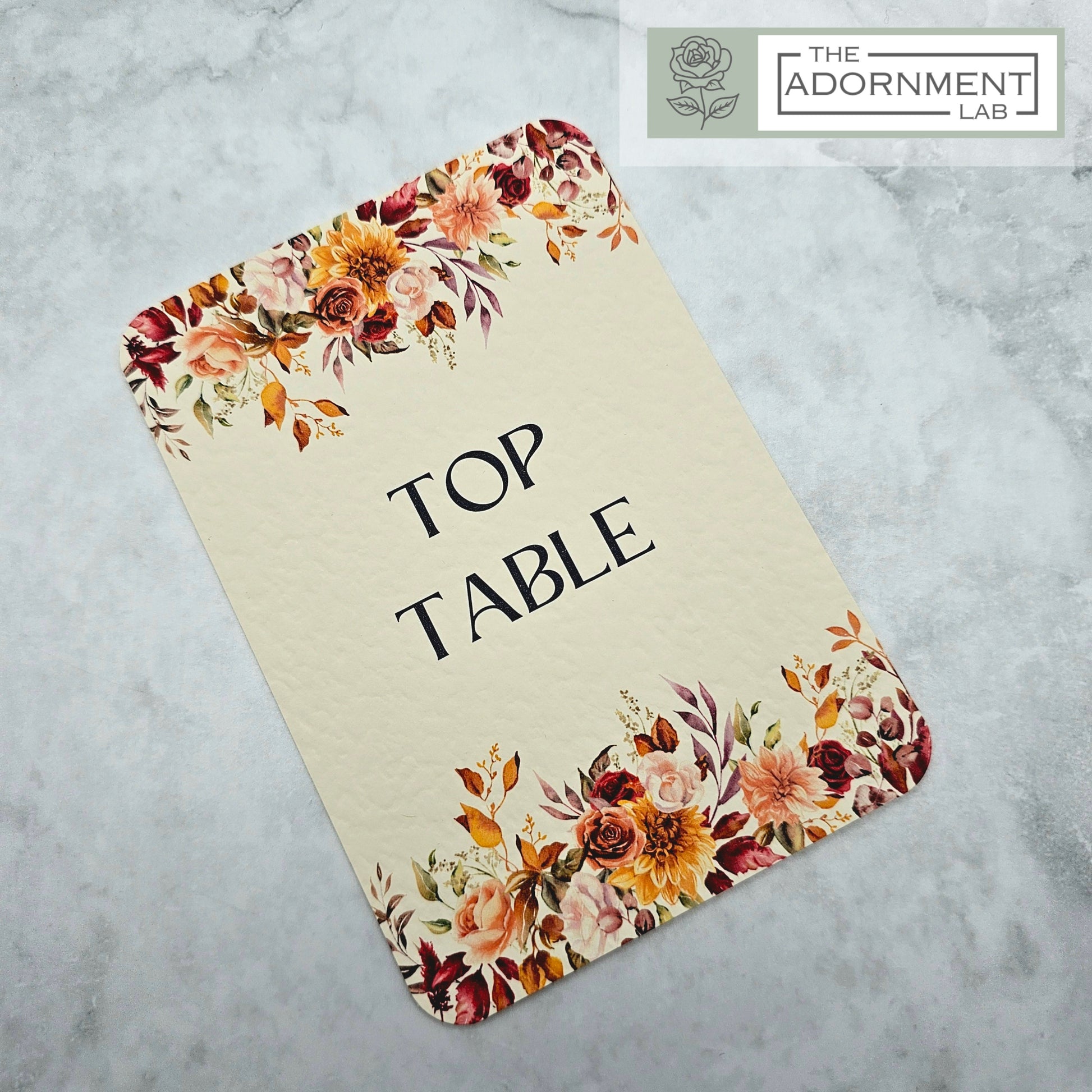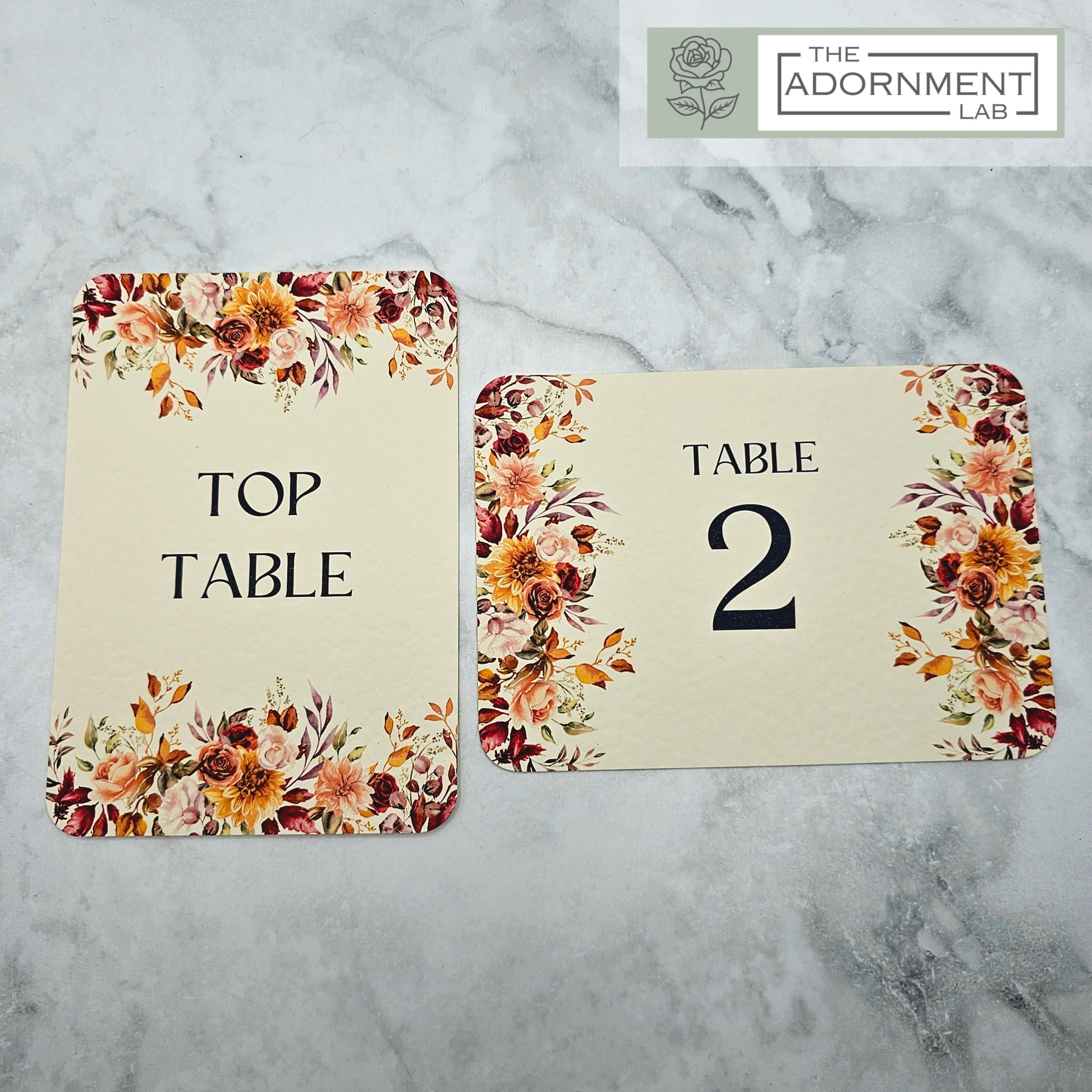 Get the signs you need by being able to choose Table Names or Numbers, A5 or A6, Landscape or Portrait or a mixture. Flat printed cards so can be framed, on a stand or laid out on the table. This design features beautiful autumn fall flower borders in stunning autumnal colours.