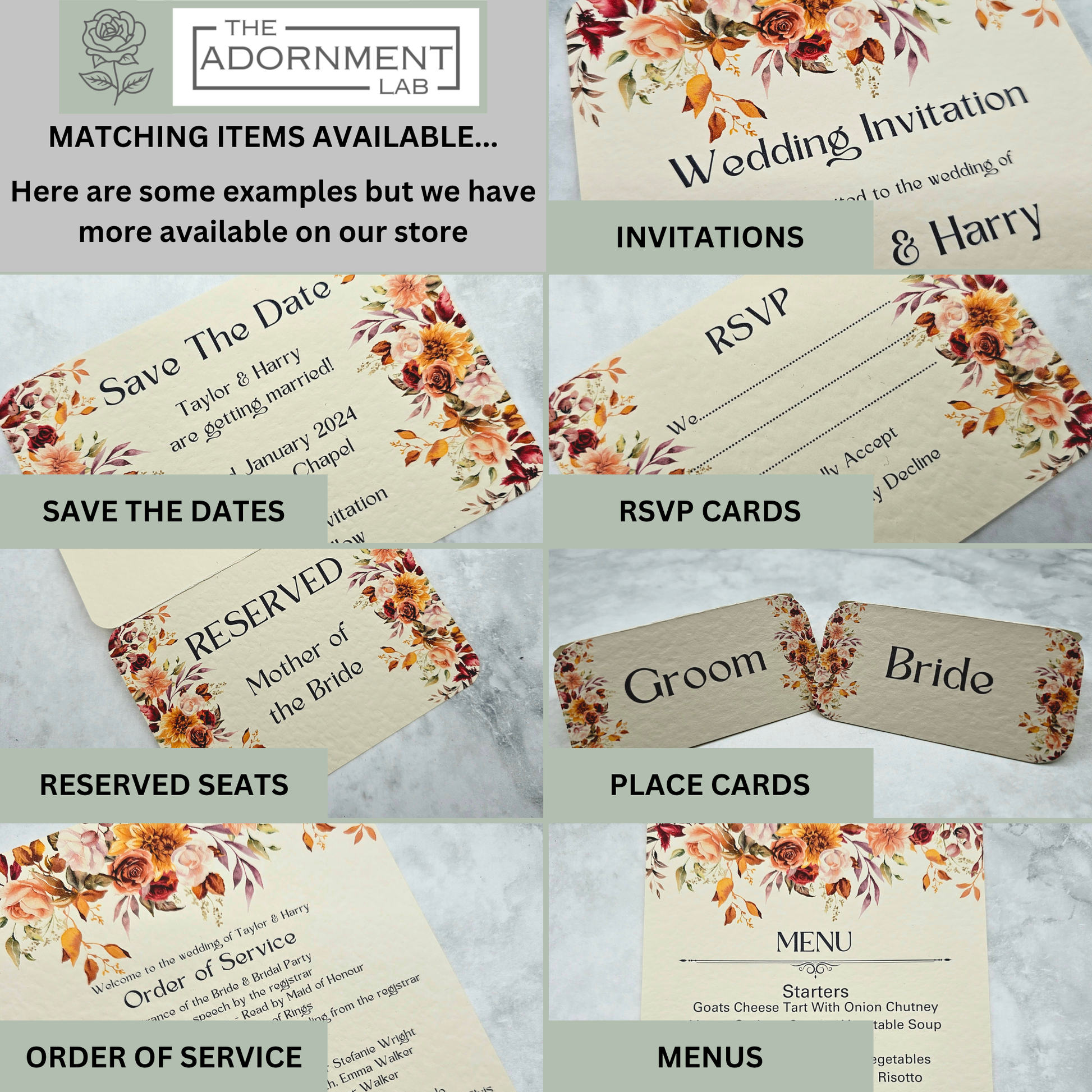 This design comes in a full range of other matching wedding stationery products available on our website. Click on the magnifying glass at the top of the the page and in the search bar type in AUTUMN FALL FLOWERS to view the full range.