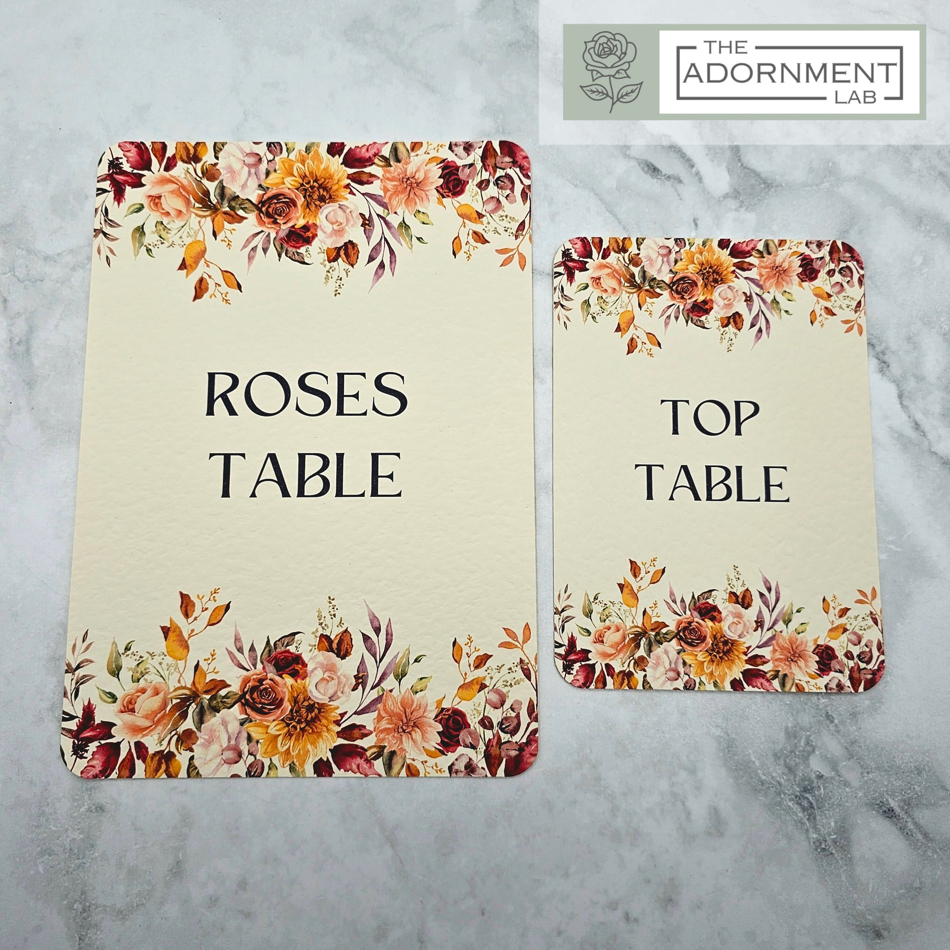 Get the signs you need by being able to choose Table Names or Numbers, A5 or A6, Landscape or Portrait or a mixture. Flat printed cards so can be framed, on a stand or laid out on the table. This design features beautiful autumn fall flower borders in stunning autumnal colours.